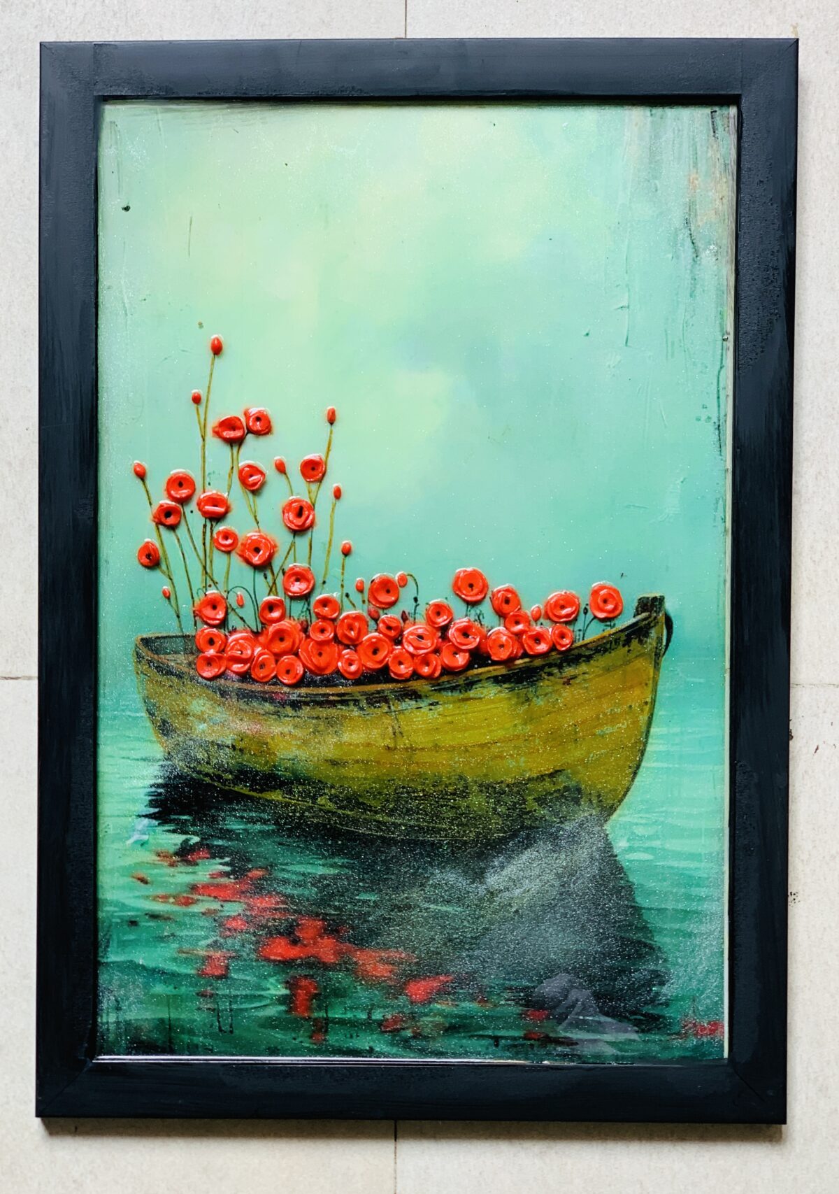 This artwork blends the charm of handcrafted clay art with the elegance of resin. Each delicate flower is sculpted by hand from clay, then set within a serene resin landscape that captures the calm of turquoise waters and the warmth of a drifting yellow boat. The vibrant red blossoms seem to float between reality and imagination, their glossy finish adding depth and movement.