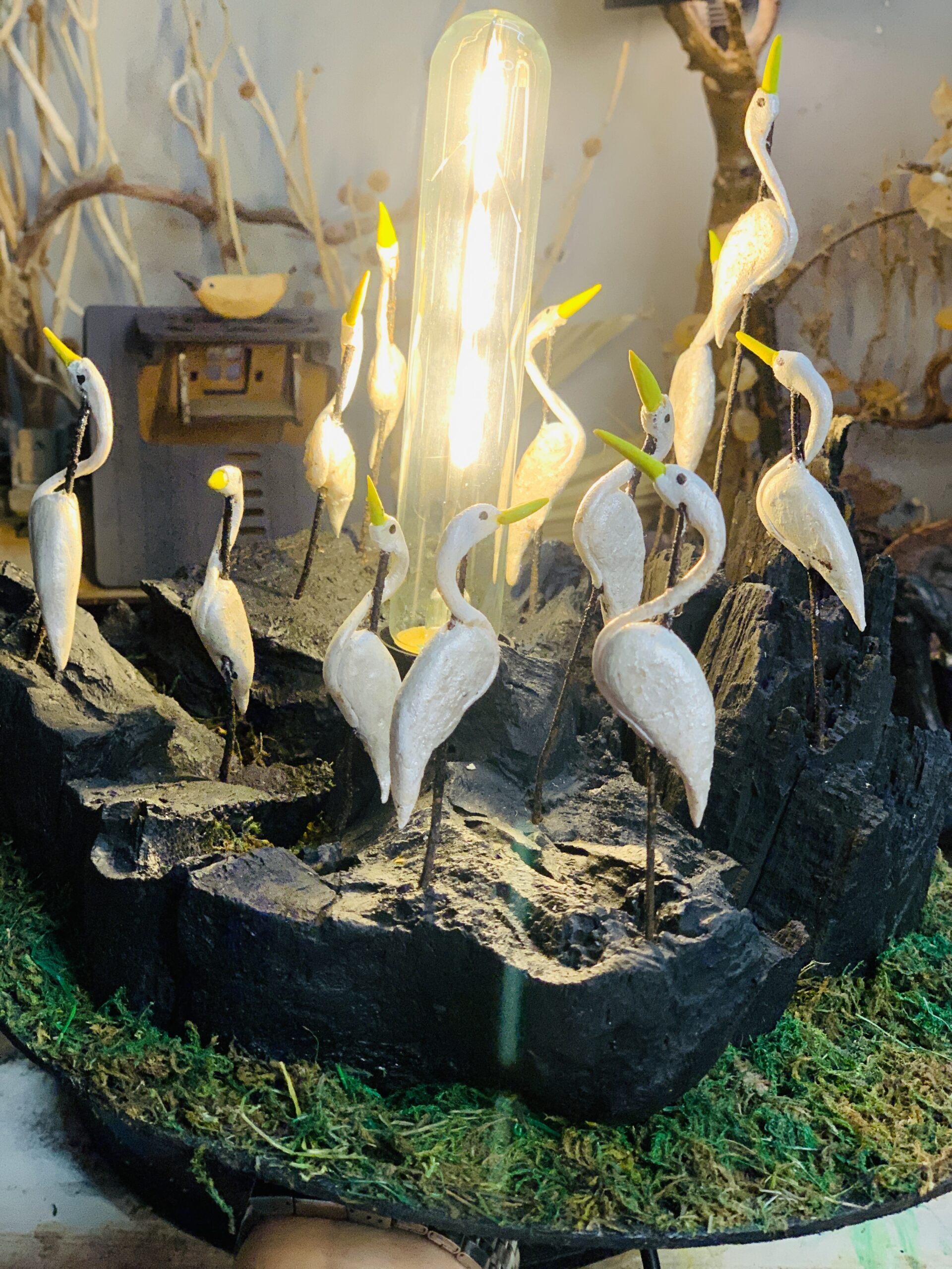 With the soft glow of the lamp casting light upon the flock, the piece transforms into a story—a union of nature and craftsmanship, where found materials and handmade artistry meet. It is not just décor, but a living expression of my creativity and passion for bringing natural elements into art.