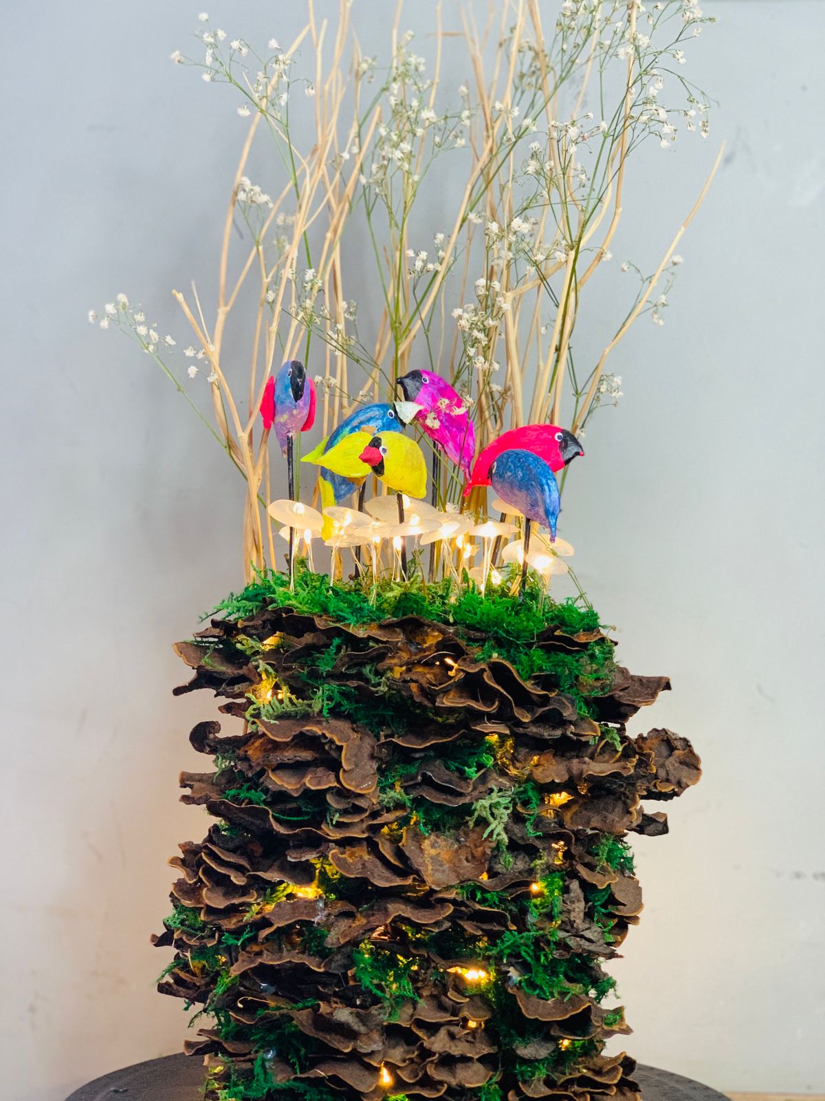 A whimsical gathering of birds perches on glowing mushrooms, rising from layers of foraged turkey tail fungi and lush moss. Each bird is hand-sculpted and painted in vivid hues, symbolizing joy, freedom, and nature’s symphony. The base is built entirely from naturally shed forest finds, brought together to create a miniature world that sings in silence.