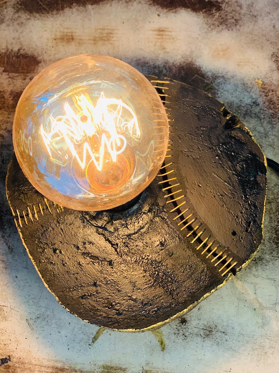 Infuse your space with warmth and character through this one-of-a-kind handmade lamp. Crafted from a natural wood slice and finished with a bold, black texture, this piece features an eye-catching golden filament bulb perched above a unique “stitched” detail — a nod to the beauty of imperfection and the art of mending.
