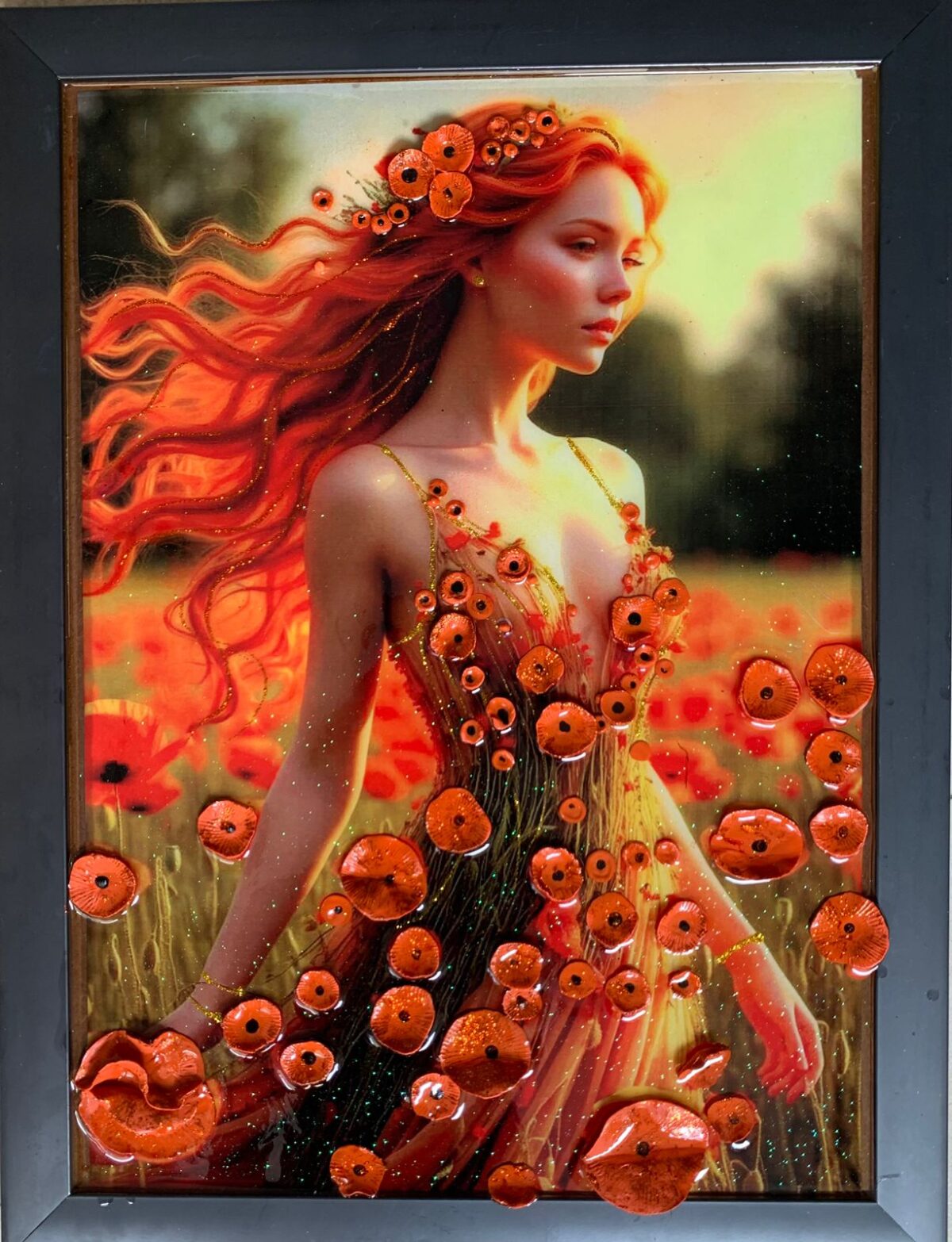This mixed-media piece combines digital artistry with textured 3D floral elements, sealed in a glossy resin finish that enhances depth and vibrancy.