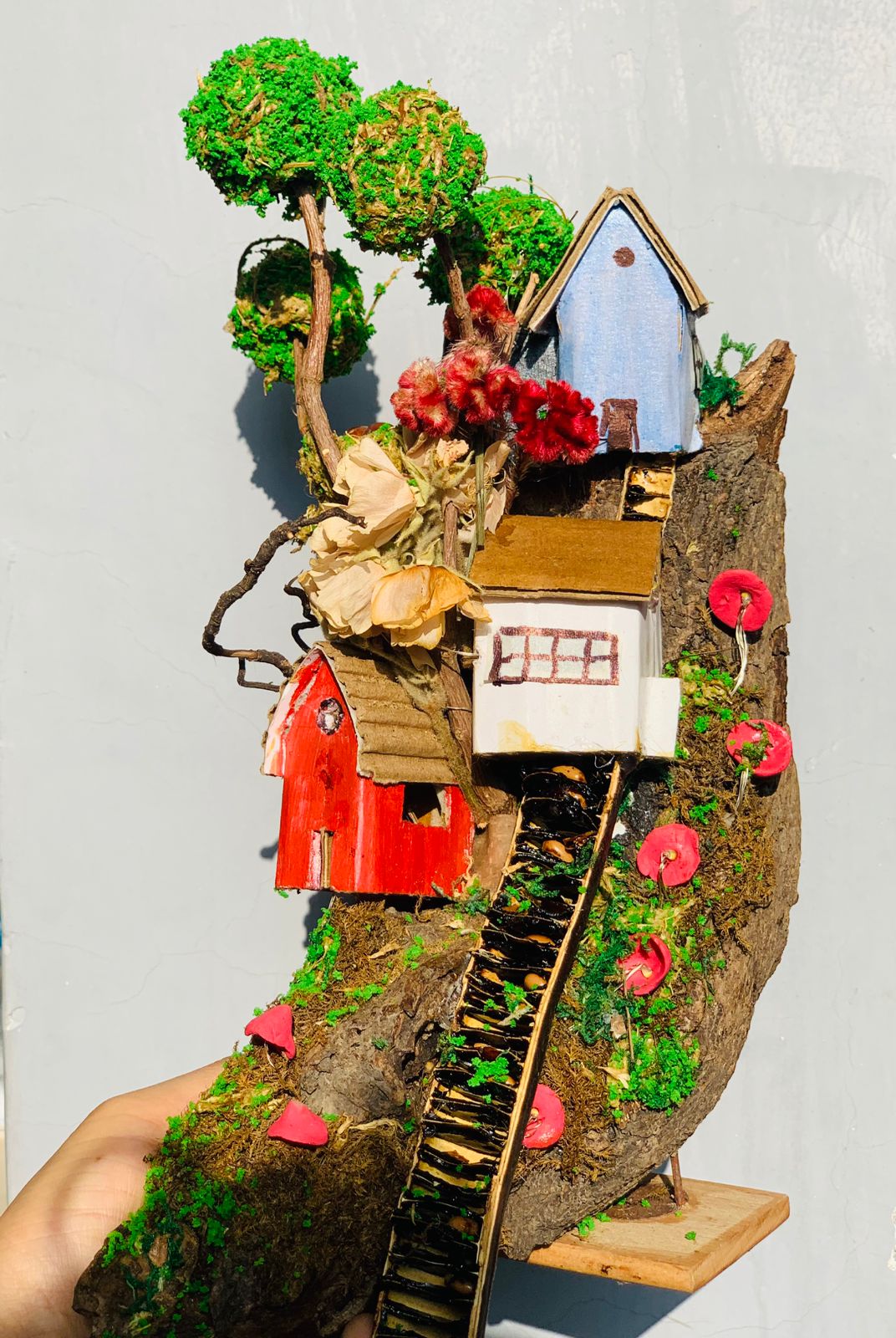 Crafted with care from natural bark, wild blooms, and hand-sculpted textures, this piece invites you to pause, imagine, and escape—just for a moment—into a world where time slows down, and magic lingers in the moss.
