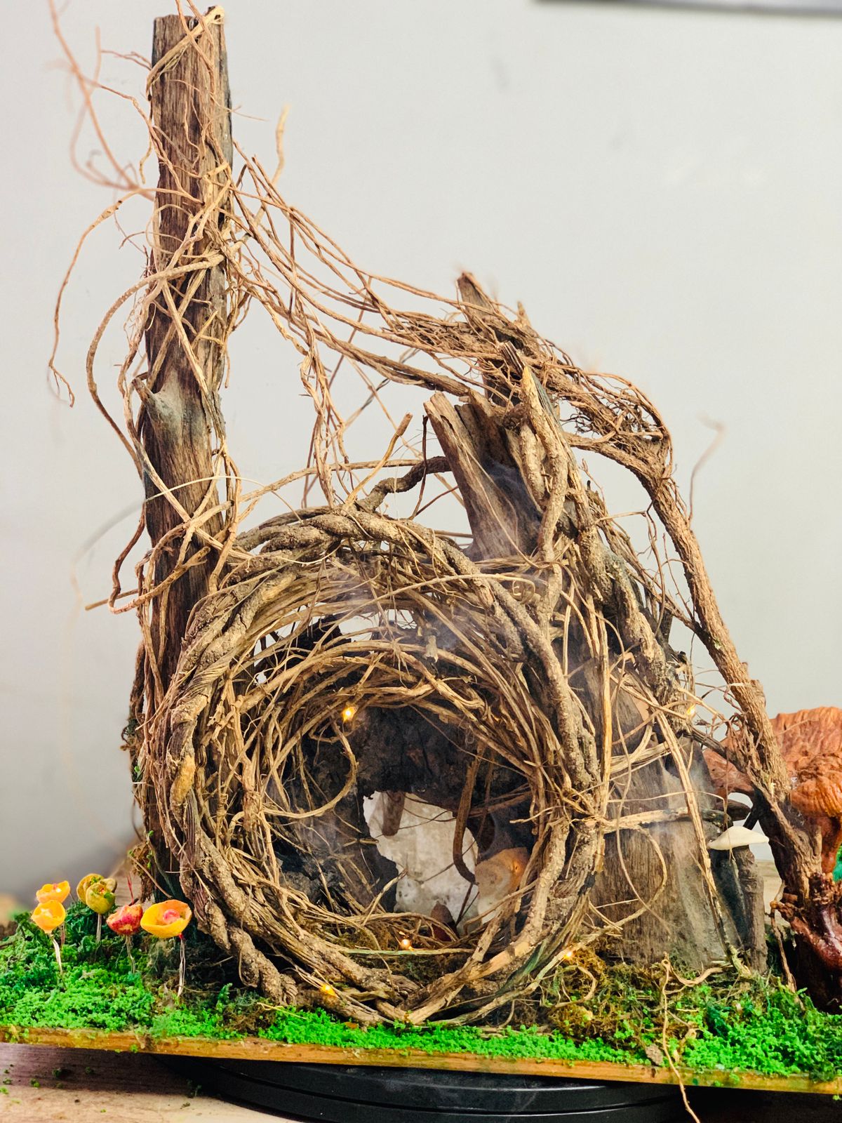 A wild spiral of vines and branches forms a sacred portal in Witch’s Hollow Portal, a fantasy diorama piece invoking ancient forest magic. Behind the twisted frame, a robed figure waits in silence — suggesting a moment between worlds. Earthy textures, glowing lights, and playful forest mushrooms complete the story of this otherworldly threshold.